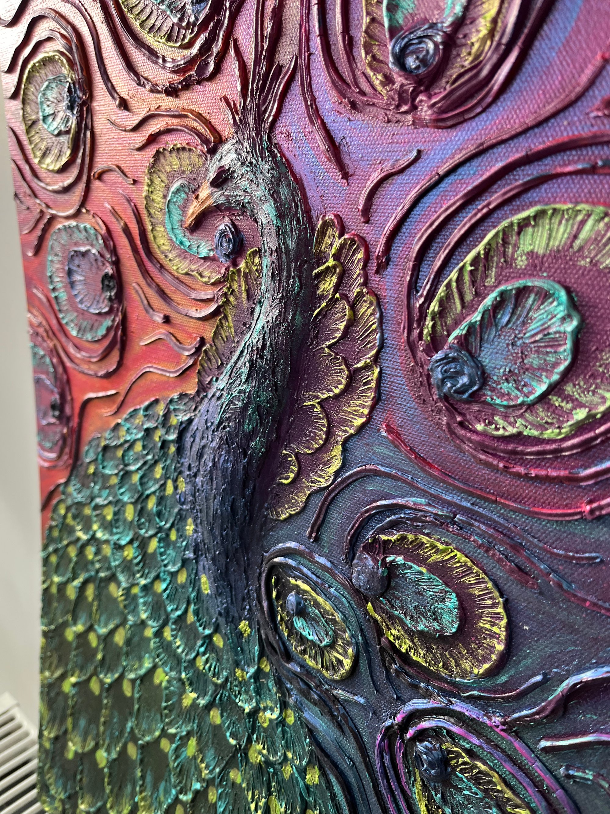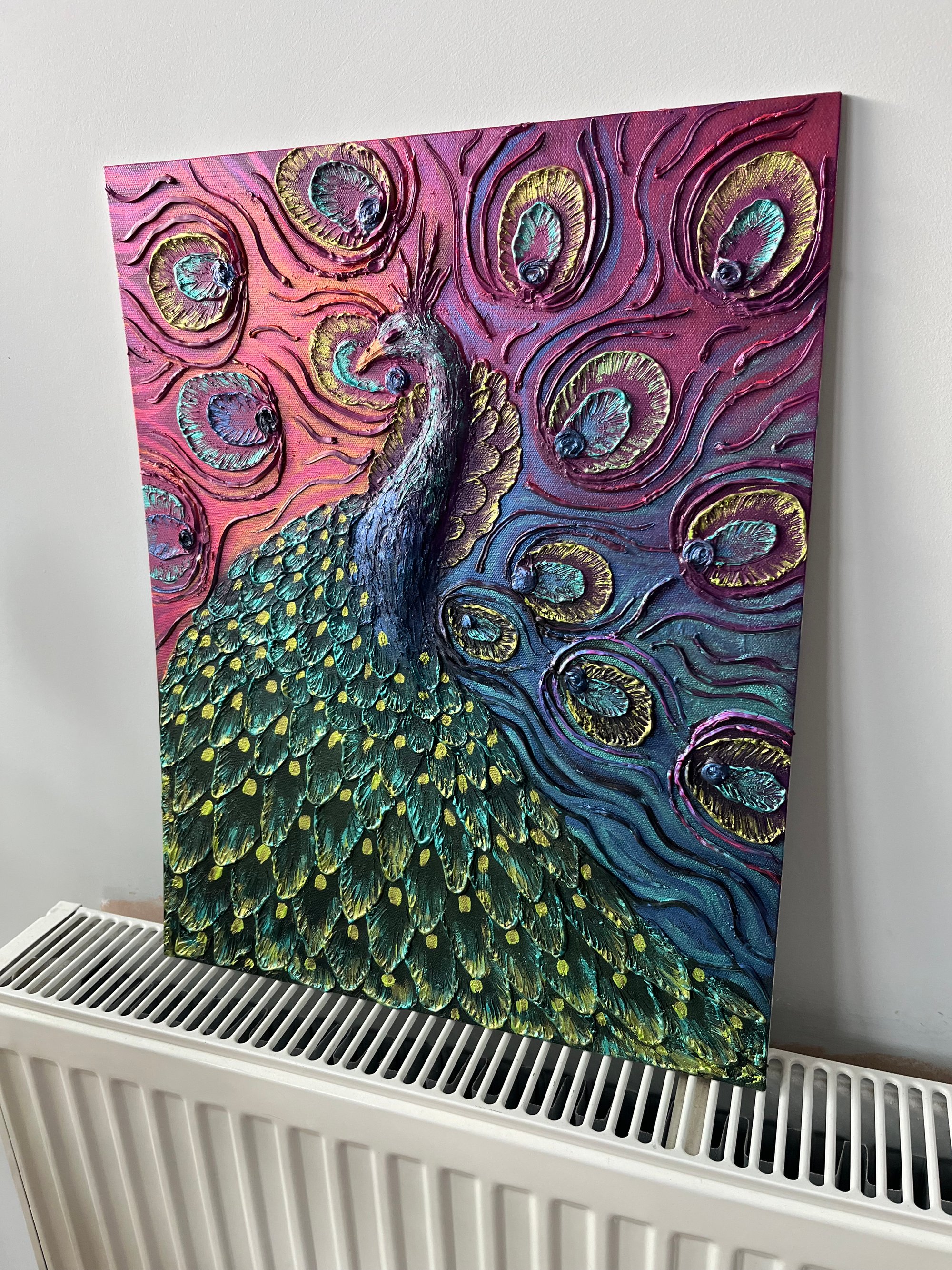 This peacock has been made using a variety of media. The peacock is made using texture paste which allows it to appear 3D. It has then been painted using acrylics and finished with a coat of varnish to seal.